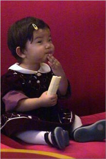 enjoyed her banana on the red coach. After the snack, we were about to